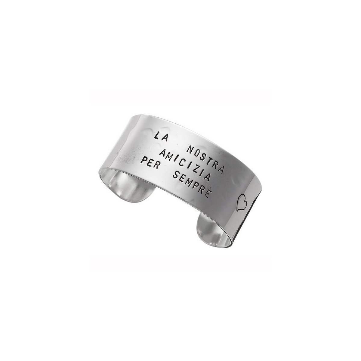 Bracciale rigido maxi, modello schiava aperta, realizzato in argento 925 dalla texture viva e irregolare, collezione 'Tattoo Bangle' con incisione punzonata "LA NOSTRA AMICIZIA PER SEMPRE" distribuita su due righe.