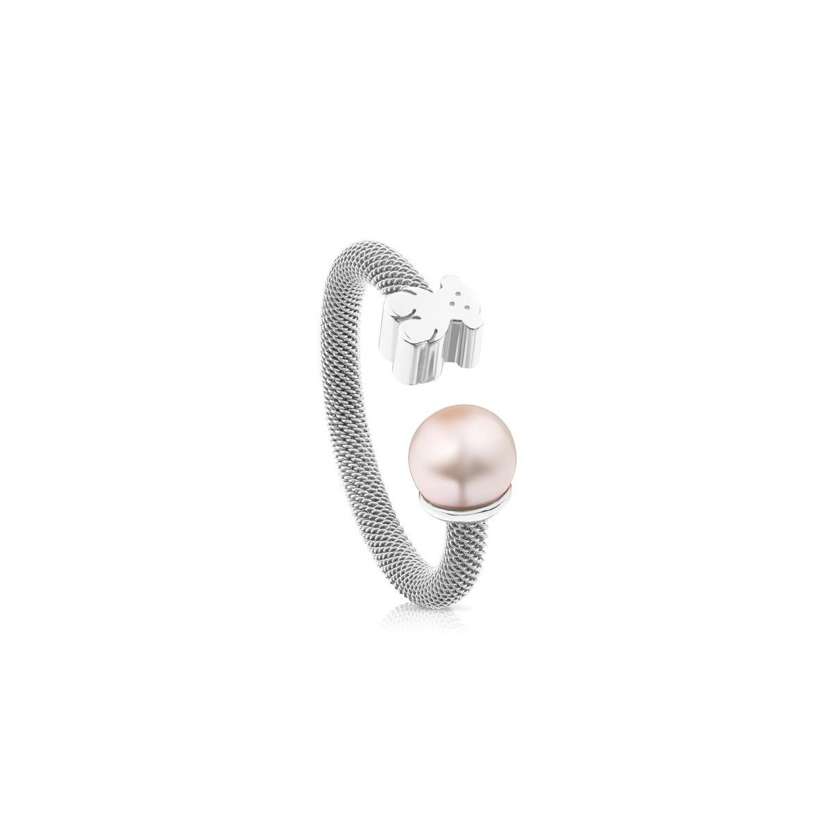 Anello tubolare in argento 925 rodiato linea Mesh con perla coltivata e orso scatolato