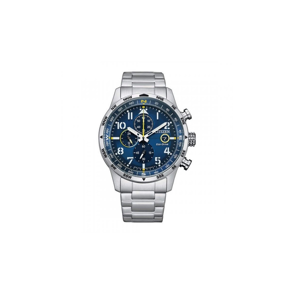 Orologio da uomo Citizen, della collezione Aviator, con funzione cronografo e movimento Eco-Drive, solare con riserva di carica fino a 270 giorni. Orologio realizzato in acciaio 316L satinato con bracciale a maglie, cassa 43 mm con fondo serrato a vite e quadrante blu con alternanza di indici e numeri arabi, lancette con LumiBrite e lancetta dei secondi di colore giallo. Chiusura deployante.