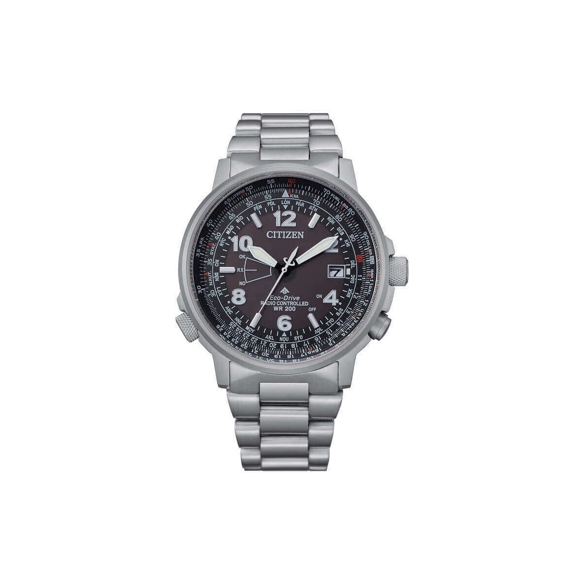 Caratteristica principale della collezione Pilot di Citizen è la funzione Radiocontrollato a 5 canali, word time con orario di 26 città e calendario perpetuo.
