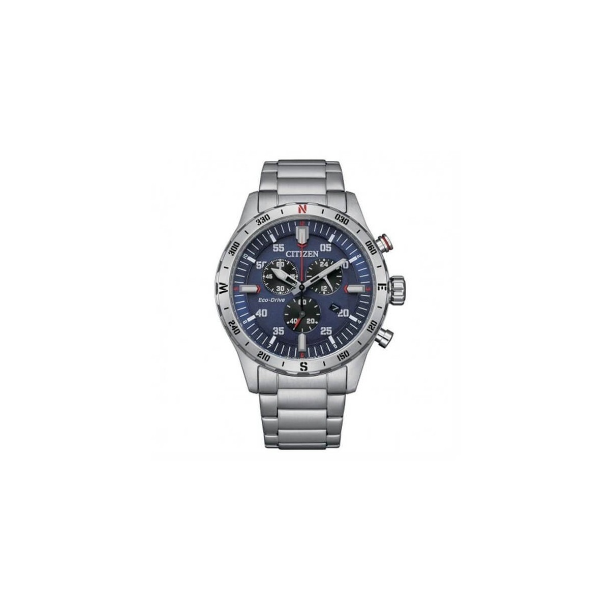 Orologio dinamico e moderno realizzato in acciaio con bracciale a maglie satinate, cassa 43,5 mm montante vetro minerale con bussola sulla lunetta, quadrante blu con tre contatori tipici dei cronografi, datario ad ore quattro, indici e lancette LumiBrite e lancetta dei secondi di colore rosso. Chiusura deployante con pulsante di rilascio.