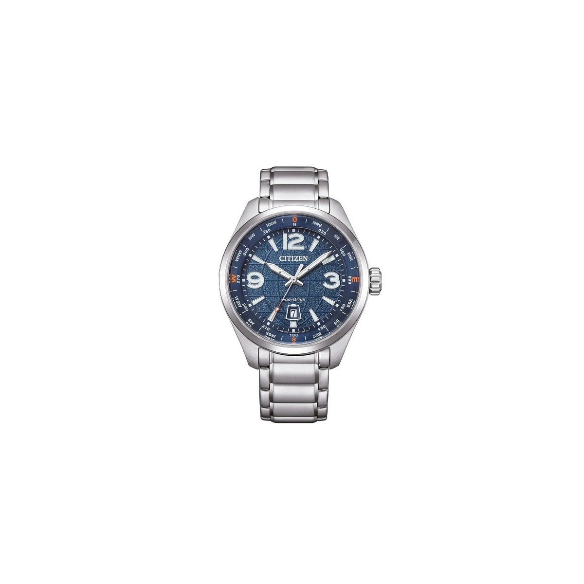 Orologio uomo Citizen, della collezione Outdoor modello Urban Travel , con funzione di solo tempo e movimento eco-drive tempo e data con otto mesi di riseva di carica. Orologio realizzato in acciaio inossidabile 316L con ghiera interna con indicazione dei punti cardinali a contrasto in rosso e bianco. Quadrante blu con datario e un motivo che replica i meridiani e paralleli del globo terrestre. Vetro minerale convesso. Chiusura deployante.