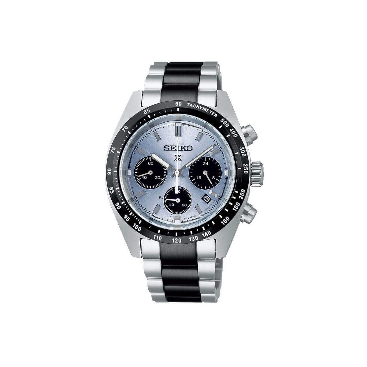 Orologio maschile Seiko,della collezione Prospex speedtimer, con movimento cronografo solare alimentato dal calibro V192. Orologio realizzato in acciaio satinato con bracciale a maglie con centrale in pvd nero, la cassa ha un diametro di 41 mm con tachimetro su ghiera in acciaio brunito, vetro zaffiro con antigraffio ed antiriflesso e quadrante color celeste avio, indici e lancette con lumiBrite per una maggiore leggibilità.