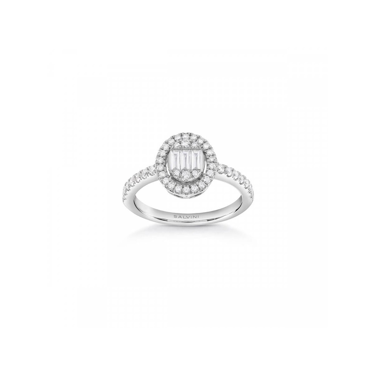 Anello solitario Salvini della nuova collezione Magia realizzata in oro bianco 18 carati e diamanti naturali centrali taglio baguette da 0,08 carati totali impreziosito da una corona di piccoli diamanti 0,27 carati distribuiti intorno alle baguette e sul gambo