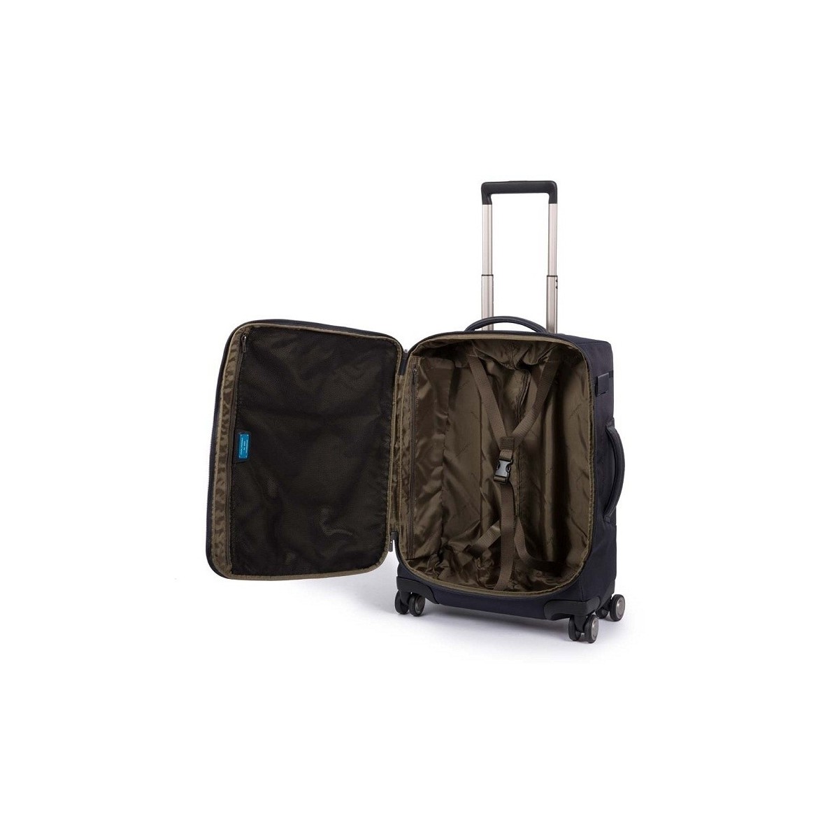 Trolley bagaglio a mano collezione Brief in tessuto e pelle, ultra slim a 4 ruote di colore blu con tag personalizzabile e tasca per CONNEQU. La linea Brief è realizzata in pelle dall'aspetto non omogeneo per via della lavorazione artigianale di lavatura, abbinata ad un tessuto tecnico resistente all'acqua. Tutti i modelli sono impreziositi da accessori metallici di design dalla doppia finitura canna di fucile con inserto in metallo spazzolato, marchiati Piquadro.
