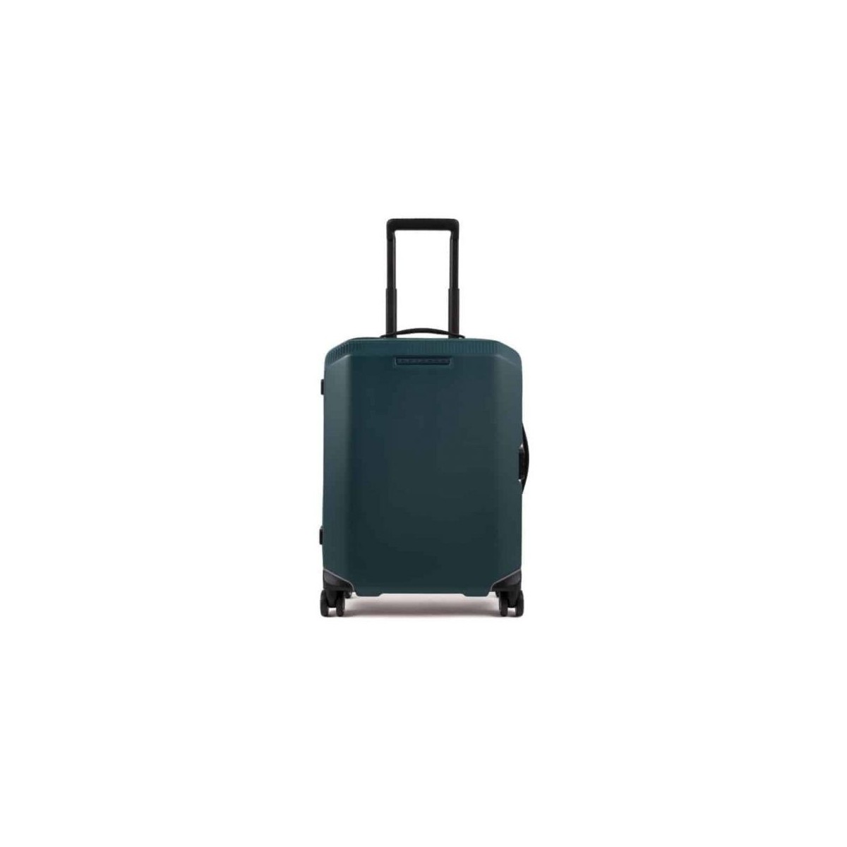 Trolley da viaggio e cabina rigido ultra slim Piquadro realizzato in policarbonato di colore verde scuro con protezione antiurto. Il trolley è caratterizzato da un singolo comparto con chiusura zip e organizzazione interna fissa e tasca per connequ. Sistema di carrello telescopico a doppio tubo, due ruote girevoli e chiusura a lucchetto TSA.
