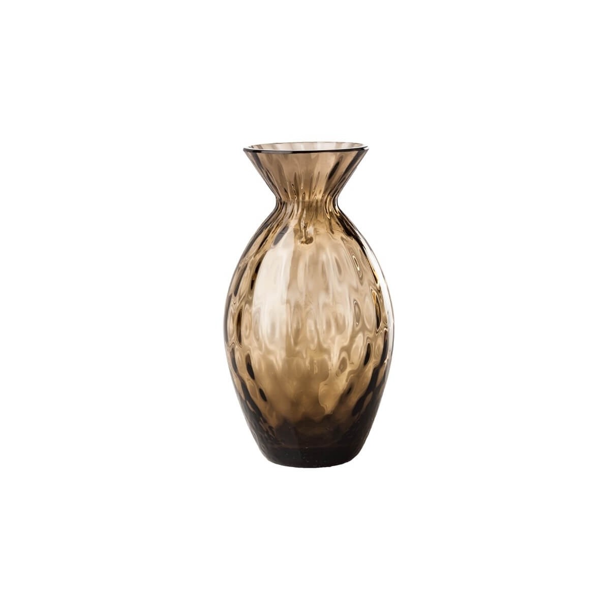 Vaso Venini della collezione Gemme Ballonton a forma di ampolla realizzato in vetro do Murano di colore talpa soffiato e lavorato a mano con tecnica ballonton, in cui l'artigiano durante la soffiatura riempie il vuoto di uno stampo in metallo che ne restituisce un effetto ottico di rilievo incrociato.