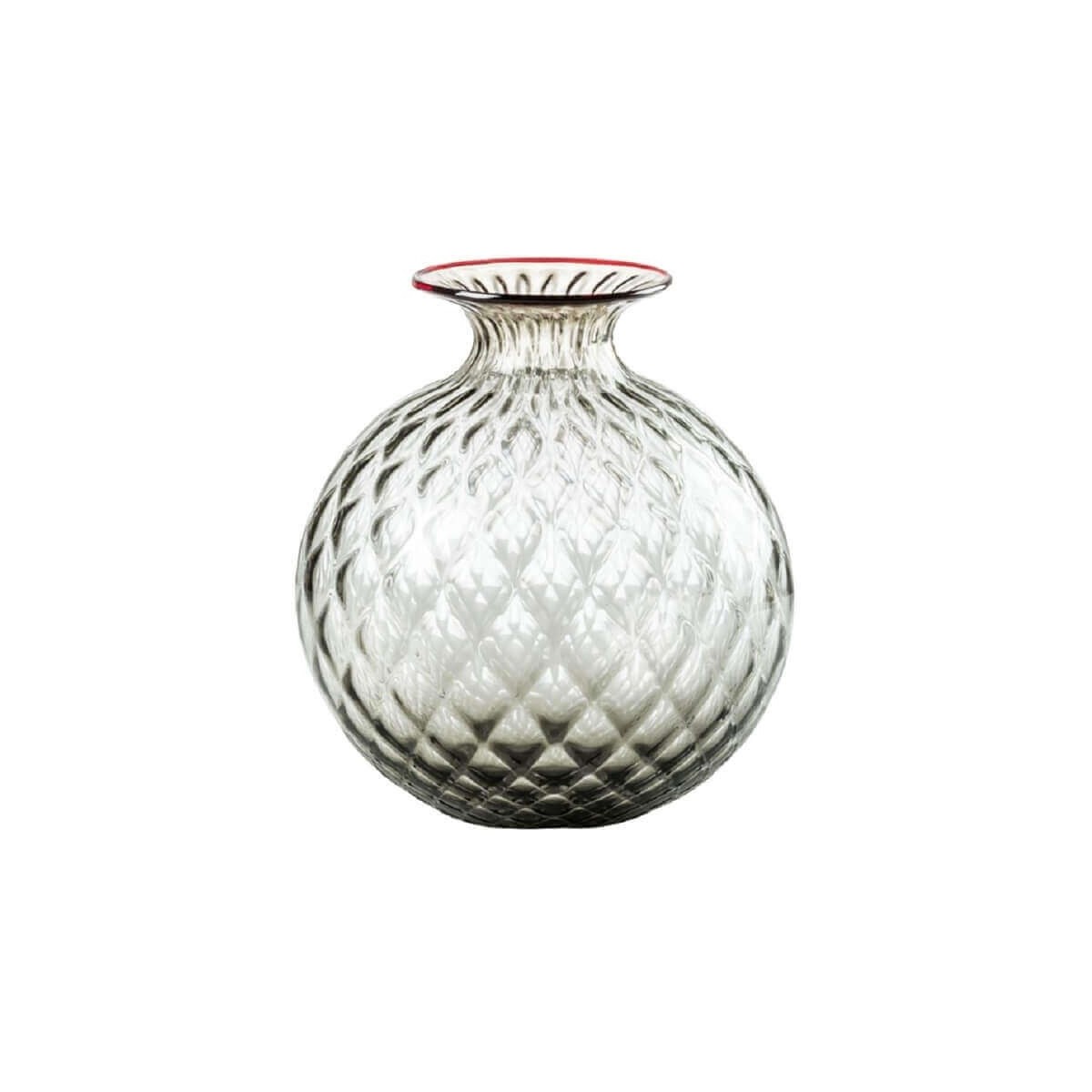 Vaso monofiore Venini della collezione Balloton realizzato in vetro soffiato a mano incolore, con la tradizionale tecnica a balloton che ricrea sulla superficie l'effetto matellassè, con filo riportato a caldo sulla parte superiore di colore rosso.