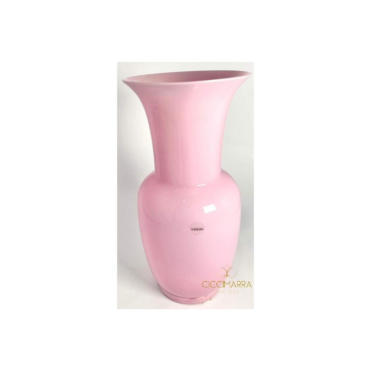 Vaso medio Venini, della collezione Opalino, in vetro di Murano soffiato, ottenuto dalla sovrapposizione del lattimo con altri vetri e lavorato a mano, di colore rosa confetto. Aggraziato nei toni come nella forma, dalle linee essenziali e raffinate.