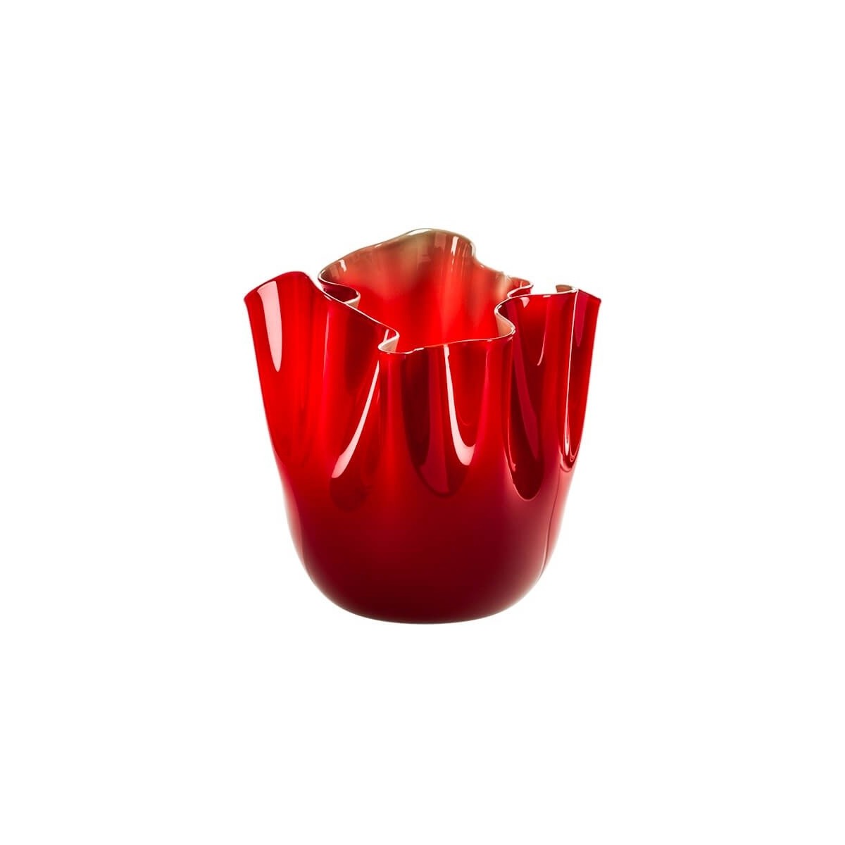 Vaso medio Venini, della collezione Fazzoletto, in vetro di Murano soffiato opalino, ottenuto dalla sovrapposizione del lattimo con altri vetri e lavorato a mano, di colore rosso e verde