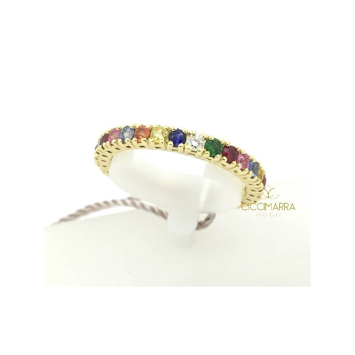 Sbarazzino e frizzante sono questi gli aggettivi che si addicono di più a questa nuova variante di un gioiello Classico Salvini. Anello veretta circolare realizzato con zaffiri naturali di vari colori, rubini rossi naturali e diamanti naturali taglio brillante, un mix di colori irrsistibile che incontra sia il gusto di una donna classica e stilosa sia il gusto della ragazza giovane e brillante.