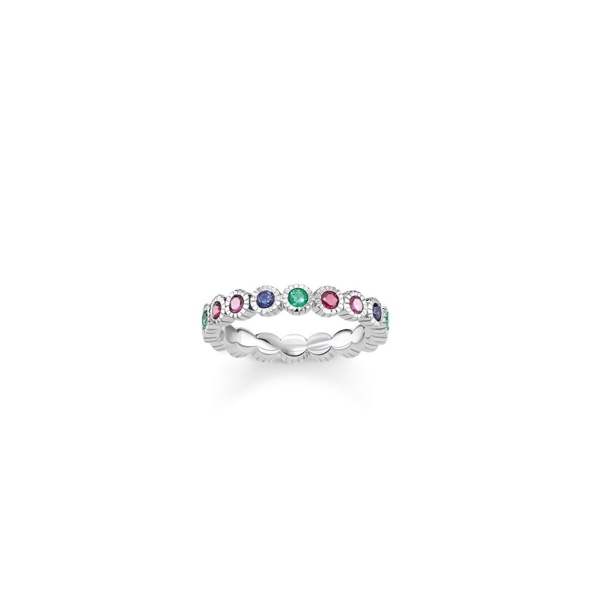 Anello Royalty in argento sterling 925 niellato e pietre colorate: corindone sintetico rosso, spinello sintetico blu scuro, gemma vetro-ceramica.