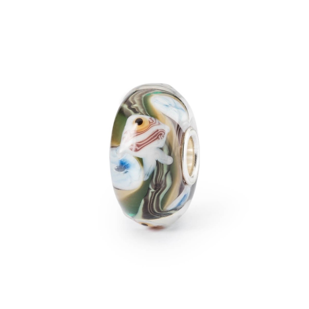 Beads in vetro con rivetto in argento raffigurante il fondale marino dai colori verde, sabbia e celeste.