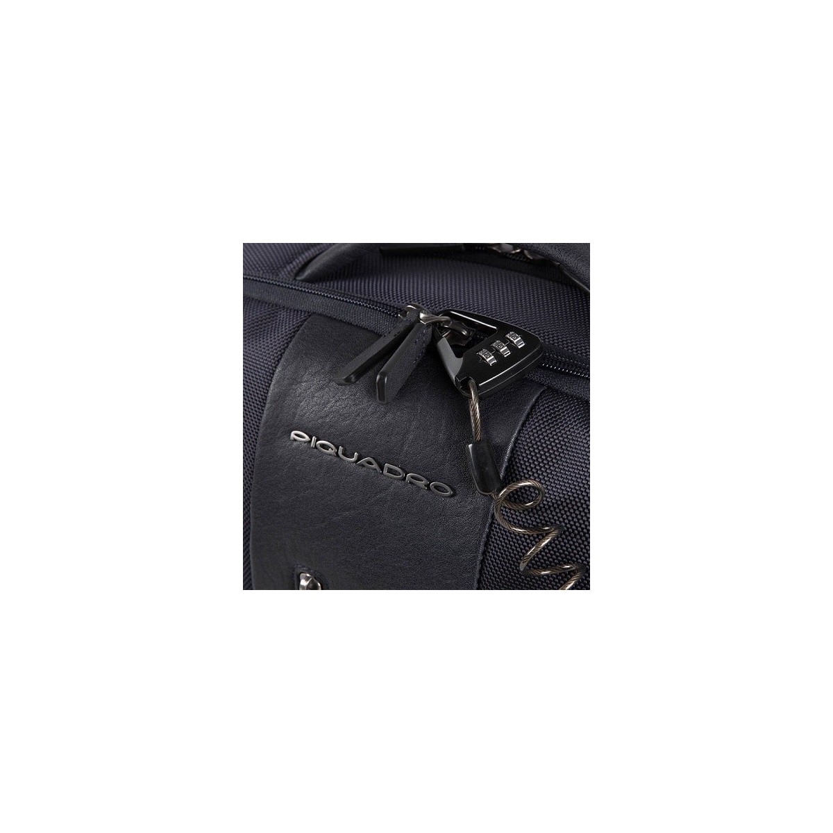 Zaino unisex porta PC e porta iPad® con cavo antifurto, tasca per CONNEQU e protezione anti-frode RFID,in tessuto e pelle nera della collezione Brief. La linea Brief è realizzata in pelle di vitello pieno fiore conciata al vegetale dall'aspetto non omogeneo per via della lavorazione artigianale di lavatura, abbinata ad un tessuto tecnico resistente all'acqua. Tutti i modelli sono impreziositi e rifiniti grazie agli accessori metallici di design dalla doppia finitura canna di fucile con inserto in metallo spazzolato, marchiati Piquadro.